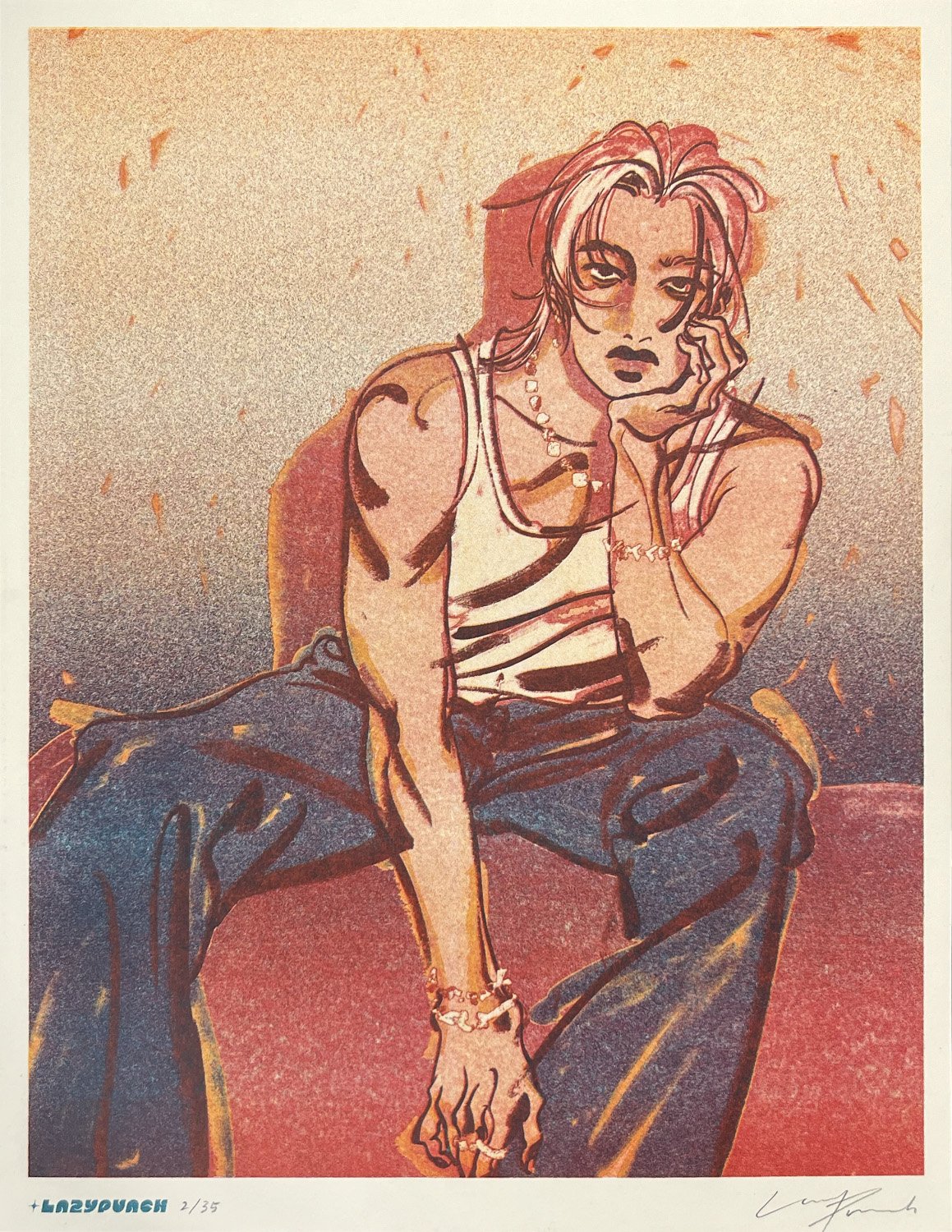 The risograph printer is a very charming, eco-friendly machine that layers vivid ink colors with a process similar to screenprinting. Due to this technique, each print is unique and has it's own small quirks! Every print is manually registered, trimmed, inspected, and signed by me. Please be careful when handling the print as the ink doesn't ever truly dry and can be prone to smudging or fingerprints. Avoid direct sunlight.