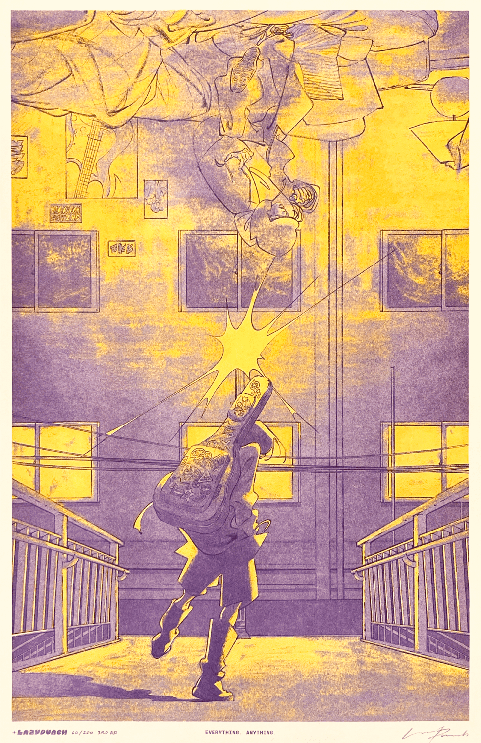 A homage to Han's solo HOLD MY HAND and the continued storyline from ALIEN, featuring both his "human" and "alien" personas. Flip this print upside-down for another display option highlighting Alien Han instead. The third edition of this print boasts smarter color seperations with more precise registration, mixing bubblegum and purple to create the violet tones used in the shadows.
